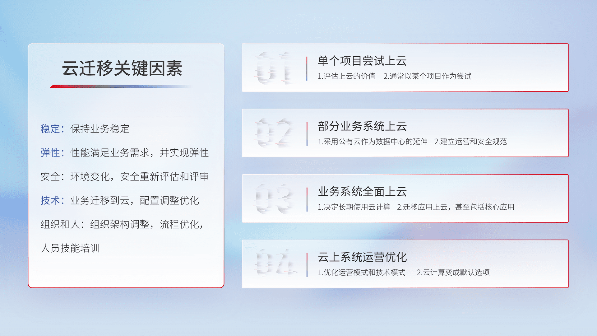结合实际业务,,,,从规划设计、、、、云平台选型、、、、云原生改造、、数据迁移、、、、集成交付,,迁移全过程为客户识别最佳上云路径,,做好风险识别管理,,设计网络架构、、、、身份权限、、安全审计合规、、、、操作审计、、、日志审计、、监控告警策略、、、多站点容灾设计等,,对云上基础设施进行整体规划,,,提升IT治理水平,,,以满足弹性、、高可用、、、高性能的需求。。。